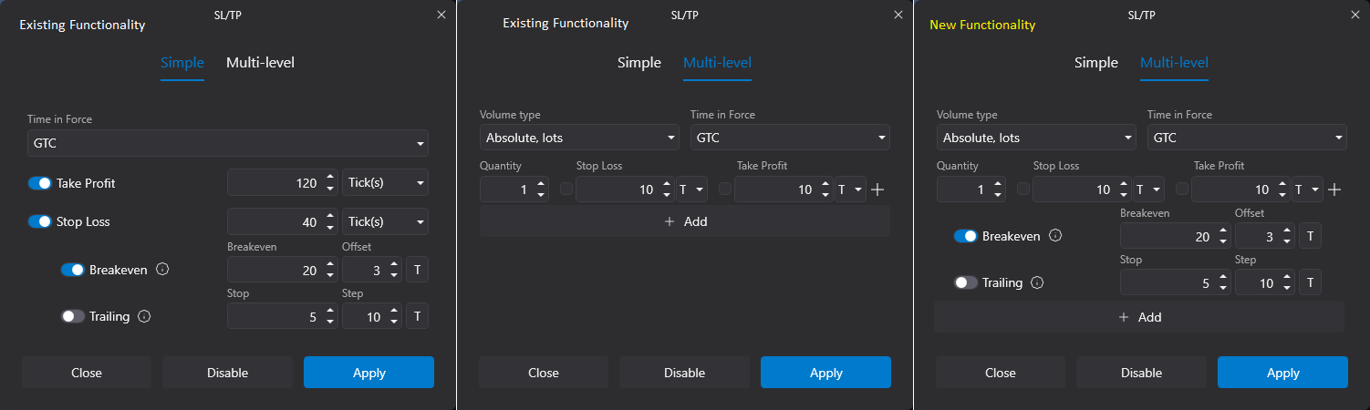 I would like the ability to be able to set the Breakeven and Trailing feature on the Multi-level strategy. Similar how it is set on the Simple strategy currently. Ideally when you have multiple quantities and you are closing partials, I would like the ability for the remaining quantities to be set to breakeven automatically or even trailing at a certain level.