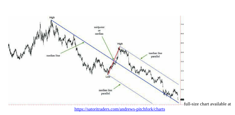 Andrews' pitchfork is a popular tool of technical analysis. It takes the form of three lines: a median line, plus an upper and a lower line equidistant from it.