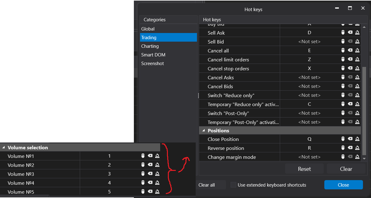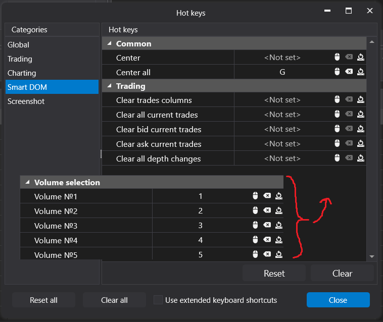 OR you can extend the Smart DOM hot keys settings with a similar tab like in Charts and allow to set volumes there: