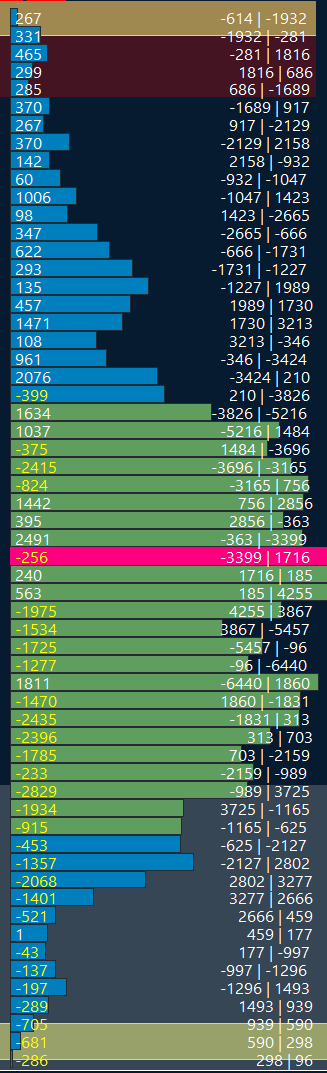Diagonal Ask Volume - Bid Volume: This displays the diagonal difference between the Ask Volume and Bid Volume. The calculation always uses the Ask Volume first, which results in the same values diagonally opposing instead of being negatives of each other as seen when using Diagonal Ask Vol Bid Vol Difference. The Bid Diagonal Ask Volume - Bid Volume is defined as: Bid Diagonal Ask Volume - Bid Volume = Ask Volume at Next Higher Price - Bid Volume at Price. The Ask Diagonal Ask Volume - Bid Volume is defined as: Ask Diagonal Ask Volume - Bid Volume = Ask Volume at Price - Bid Volume at Next Lower Price. The information is displayed as Bid Diagonal Ask Volume - Bid Volume | Ask Diagonal Ask Volume - Bid Volume - for example -51 | 530. Refer to Diagonal Comparison of Bid Volume and Ask Volume for more information on diagonal comparisons.
