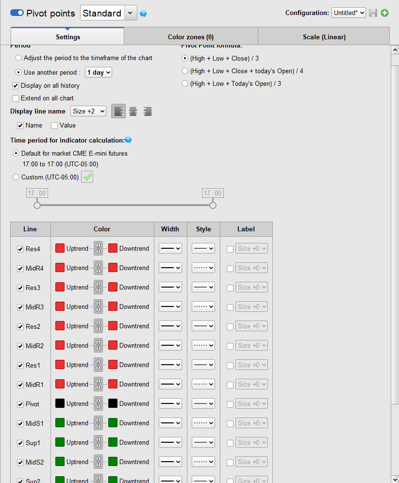 Hello, I am currently using prorealtime because I use a lot the pivot points and yours are not that great here a picture of their pivot points, I can choose any period but the main ones are daily, weekly and monthly. They offer 3 methods of calculation for the main pivot point (High + Low + Close) / 3 or (High + Low + Close + Open) / 4 or (High + Low + Open) / 3.